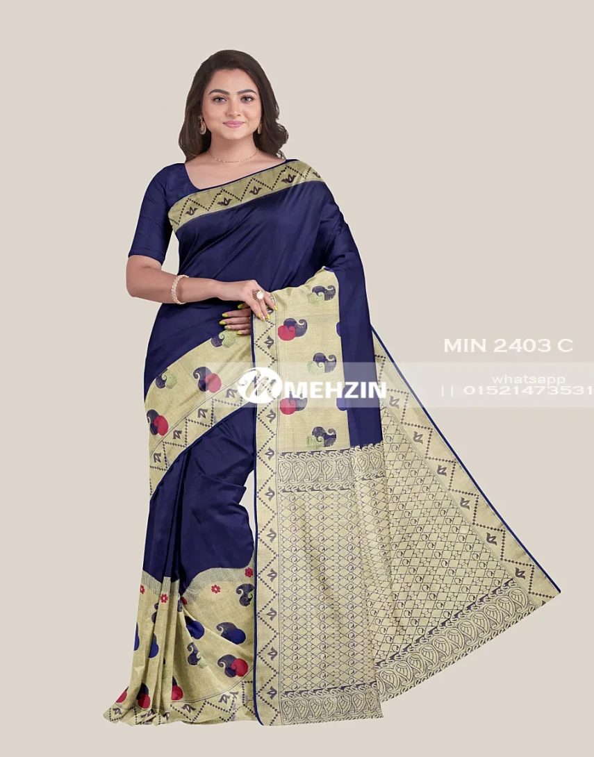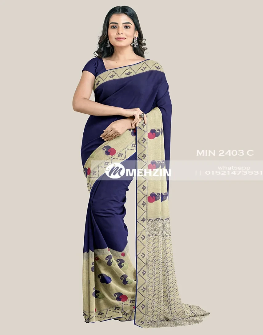শাড়িটির আকর্ষণীয় দিক হচ্ছে আচঁল এবং বডি ম্যাচিং কালারে তৈরী করা হয়েছে।ডিজাইন ঠিক রেখে কালার পরিবর্তন হতে পারে। সব মিলিয়ে আকর্ষণীয় ডিজাইনে বাজারে আছে। হাফ সিল্ক সুতার মিশ্রণে তৈরী করা হয়েছে।